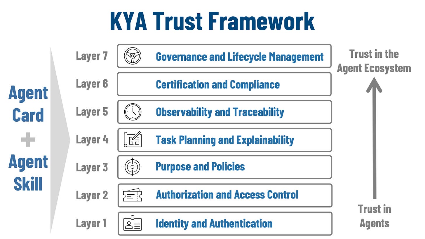 Third: in world of thousands of agents in any given enterprise, this is a scale problem: trust at scale must be federated. As the number of agents grows, no single team can manually review every agent, every change, and every action. Trust has to be built from repeatable standards that different groups can apply consistently, with shared evidence that can travel across organizational boundaries. That means capabilities that can be applied consistently across an enterprise become critical: common identity and permission models, standard ways to declare purpose and constraints, and consistent logging.