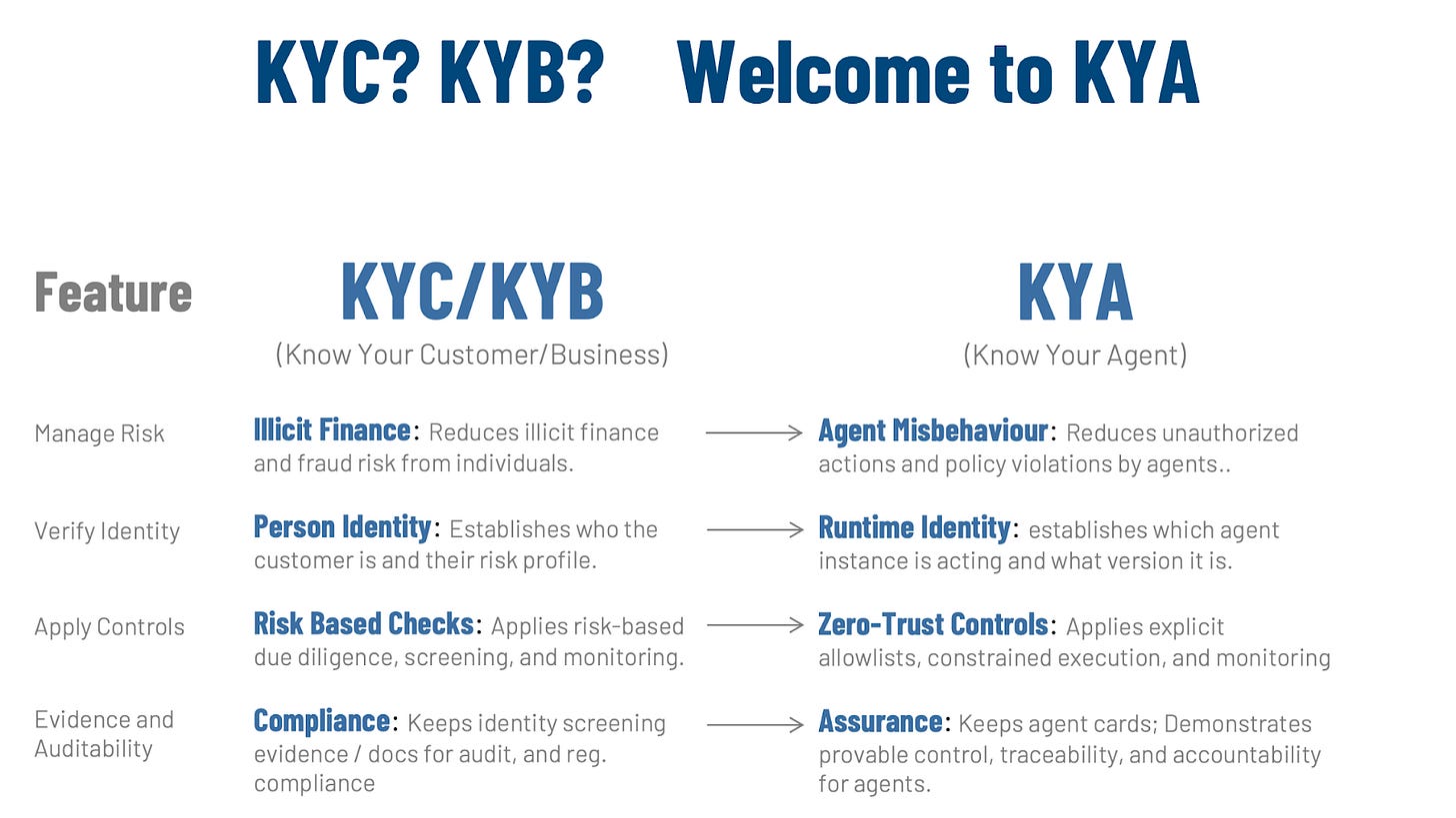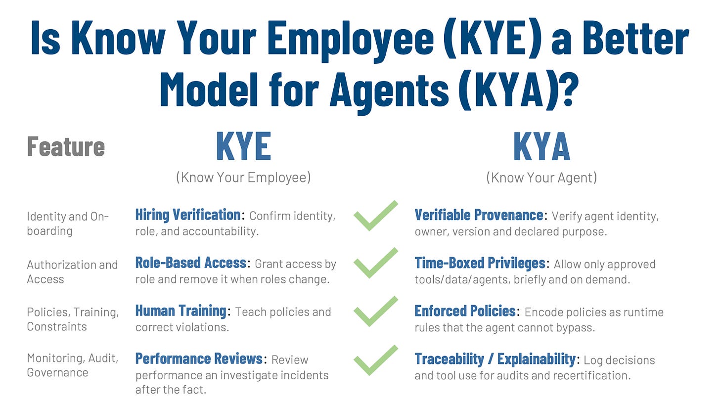 KYC and KYB are useful starting points because they teach the right instinct: if something can touch money, customers, or regulated data, you need verified identity, risk controls, and audit-ready evidence. But agents behave less like external customers and more like internal operators, which makes KYE the closer model: onboarding, scoped access, time-boxed privileges, enforced rules, supervision, and accountability. If you treat agents like employees rather than customers, you naturally design for controlled authority and traceable actions instead of one-time screening at the boundary.