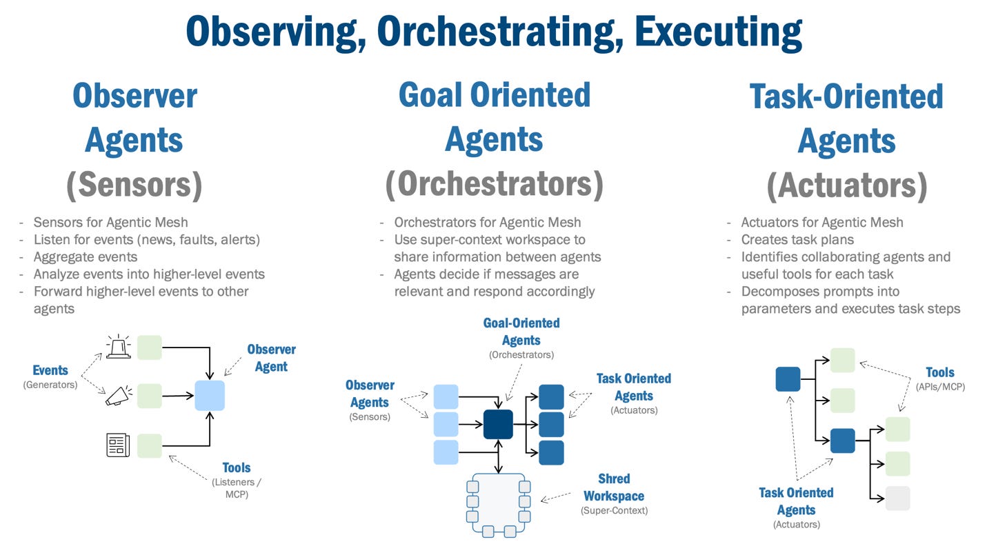 Observer agents stand apart from today’s most common agents. While prompt-driven agents react to human requests and actuator-style agents execute tasks, observers are focused on awareness. They are always listening-monitoring data streams, telemetry, and events-and they filter, aggregate, and classify signals to separate noise from insight. In this sense, they are not just passive watchers; they are the Mesh’s first line of intelligence, creating the context that other agents need to act responsibly and effectively.